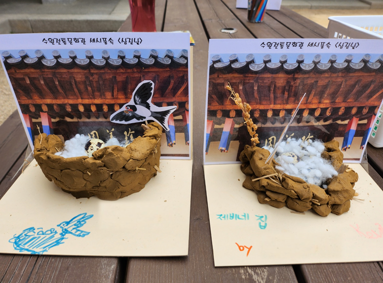 나도 제비집 건축가는 찰흙으로 제비집을 만들고 다양한 재료와 실제 메추리알을 사용해 꾸며보는 체험이었습니다. 담당 선생님께서 상세하게 설명해주셨는데, 초등학교 저학년과 유치원 아이들이 재밌어할 체험으로 생각됩니다.