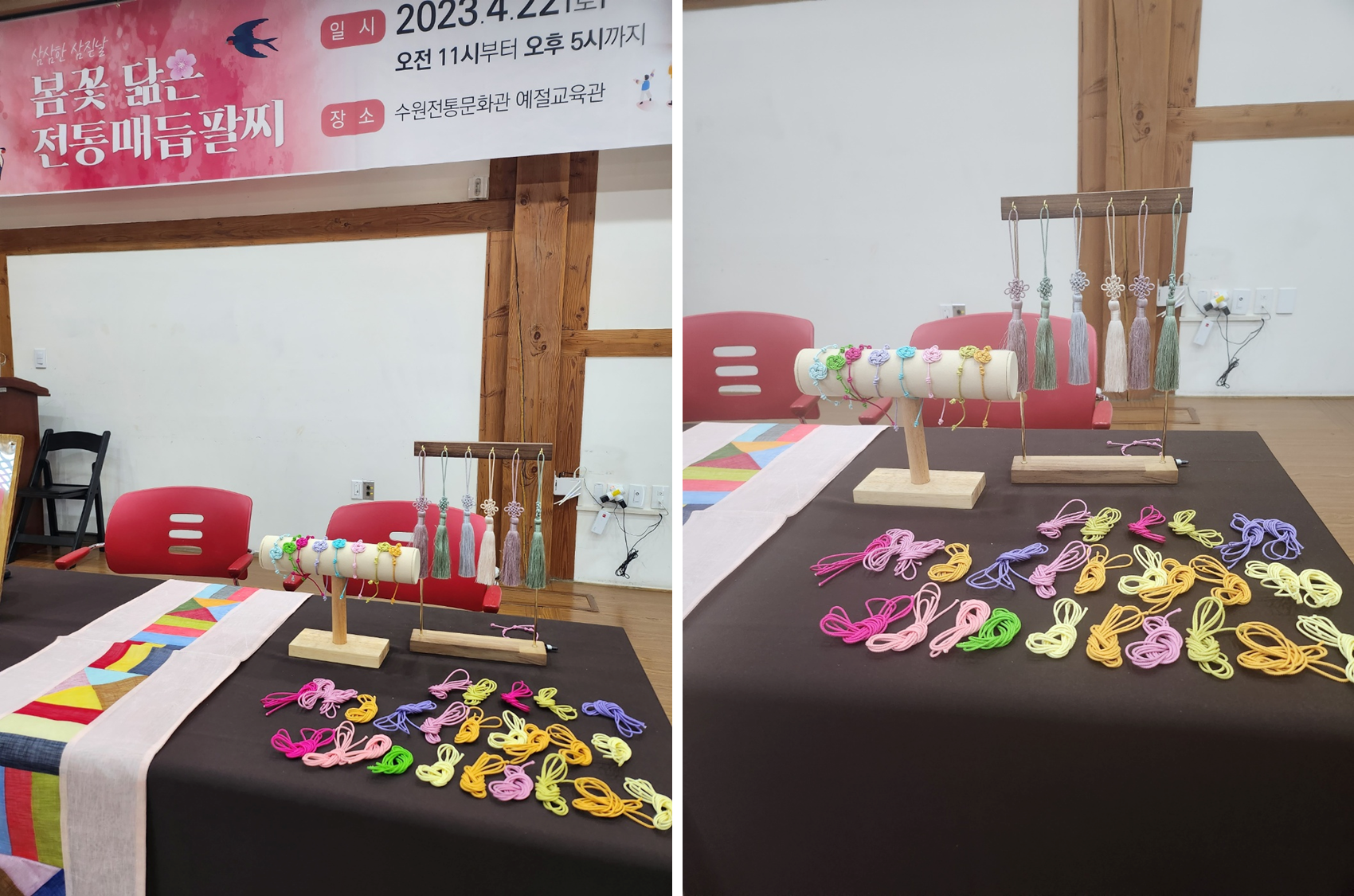봄꽃닮은 매듭팔찌는 매듭을 묶어서 팔찌를 만드는 체험이었는데, 아이들 뿐만아니라 어른들도 어려울 수 있었던 내용이었습니다. 1시간을 풀로 수업했는데 시간이 모자라는 친구들이 많았습니다.