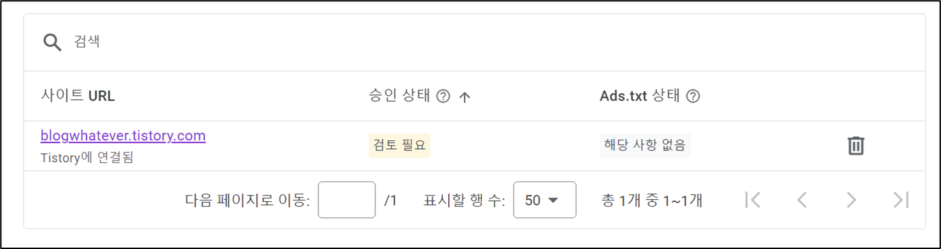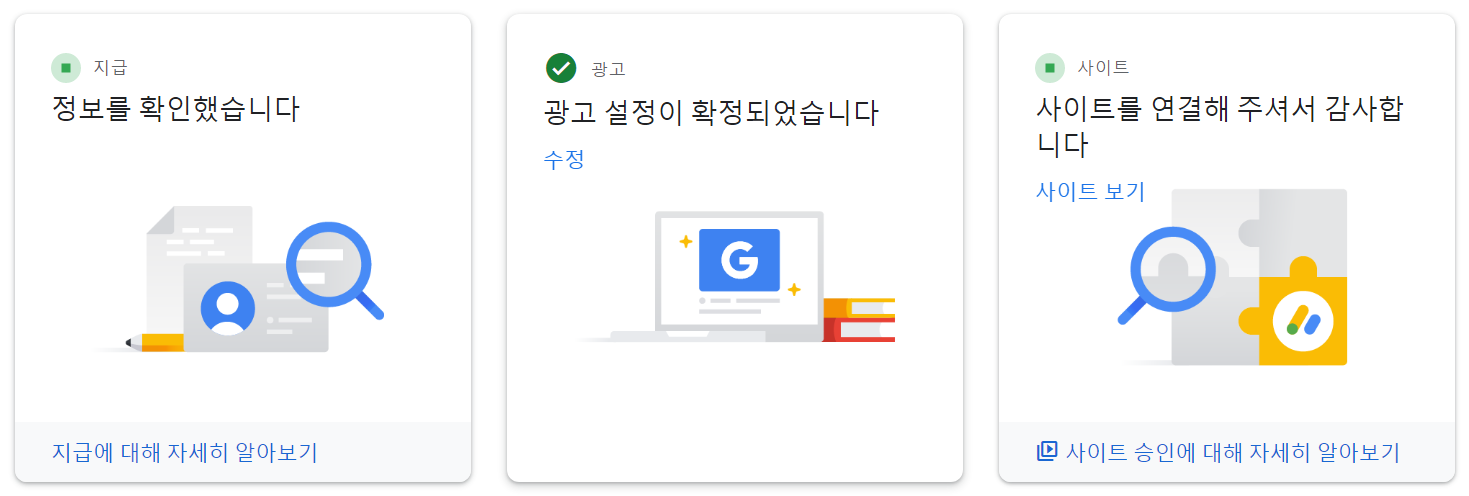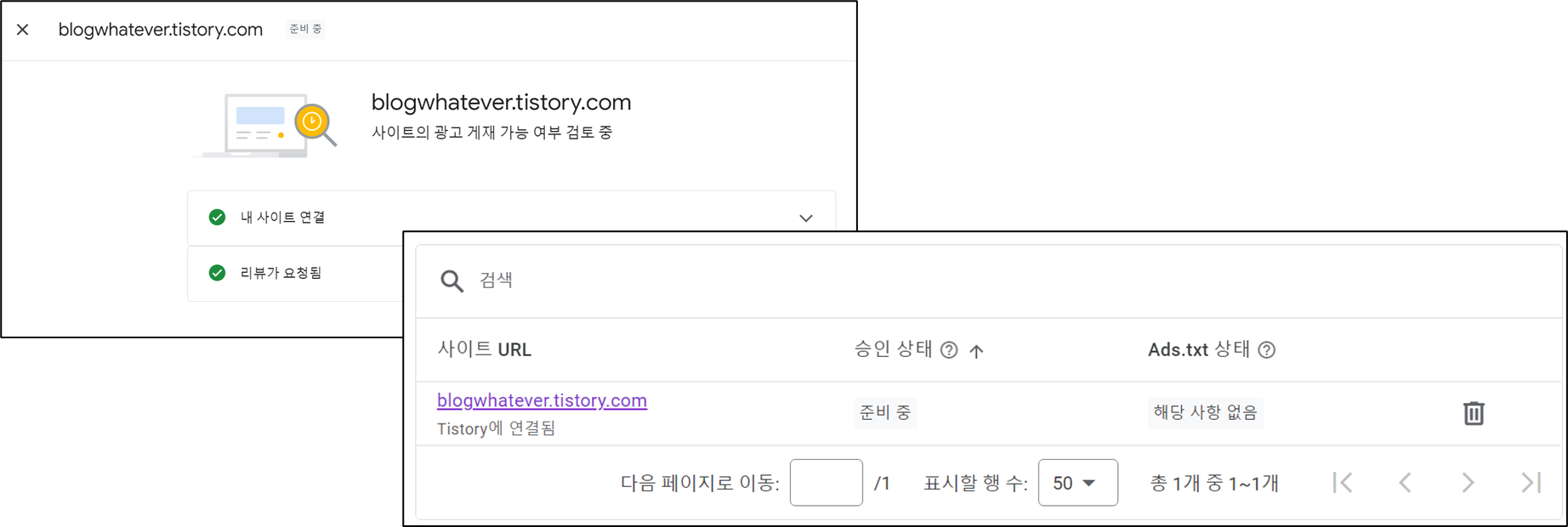 애드센스에 사이트를 연결했지만 구글 애드센스 쪽에는 여전히 검토 필요 상태임을 확인했습니다.