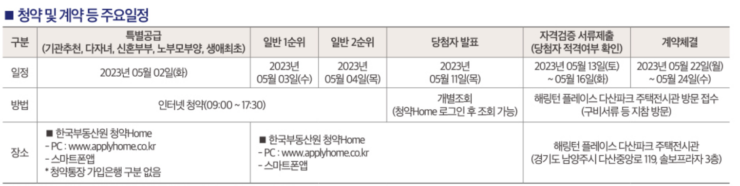 지난 4월 21일 모집 공고 후 5월 2일 특별공급, 5월 3일, 4일 각각 일반 공급이 순위별로 진행됩니다.