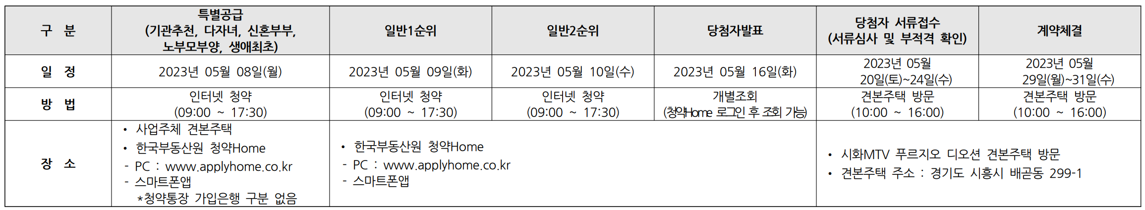 - 인터넷 청약 : 한국부동산원 '청약Home' (09:00~17:30)