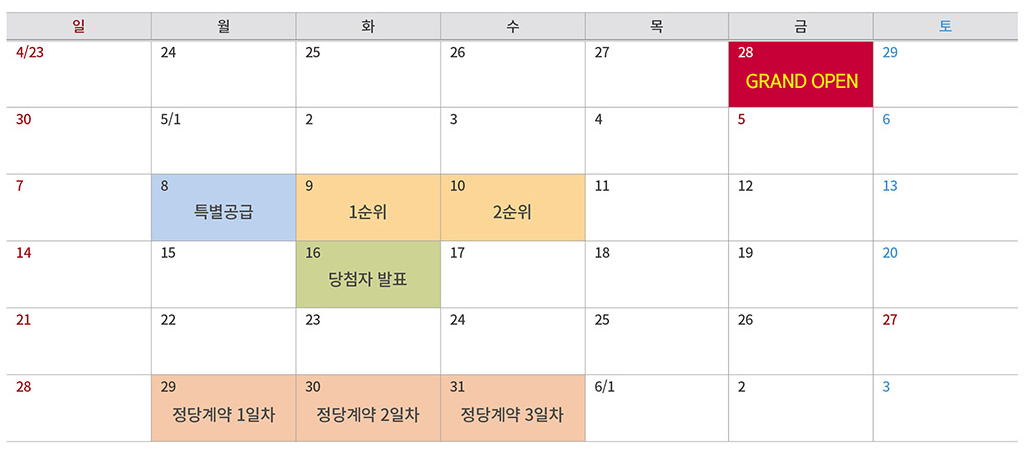 2023년 4월 28일 입주자 모집공고 후 5월 8일(특별공급), 5월 9일(1순위), 10일(2순위) 순서로 진행됩니다.