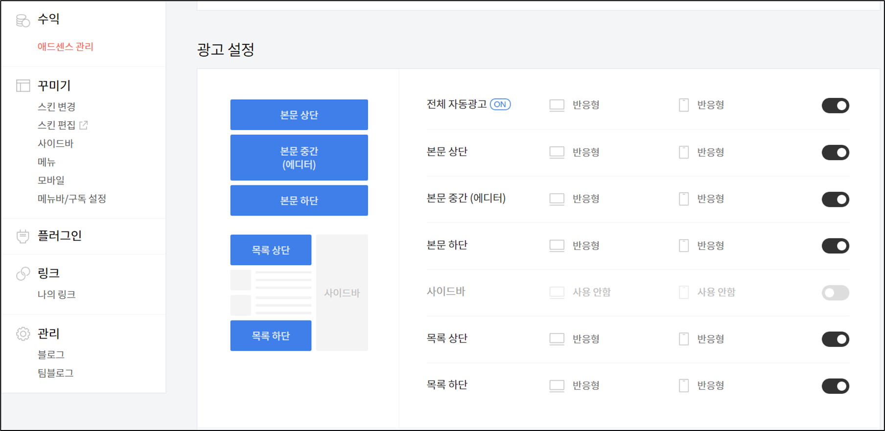 블로그관리 홈 > 수익 > 애드센스 관리 에서 광고 설정을 On/Off 하고 저장하여 광고를 활성화해야 합니다.
