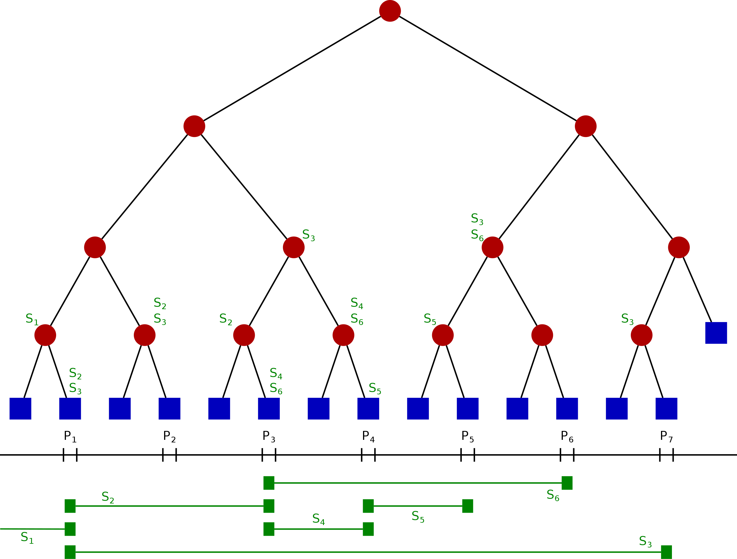 아래 그래프(출처:위키피디아) 에서 파란색 Leaf Node 가 실제 데이터가 되고, 빨간색 중간 Node 는 자식 Node 구간(하위 데이터)의 구간 결과 값이 됩니다. 최종 Root Node 는 전체 구간의 결과가 되는 구조입니다.