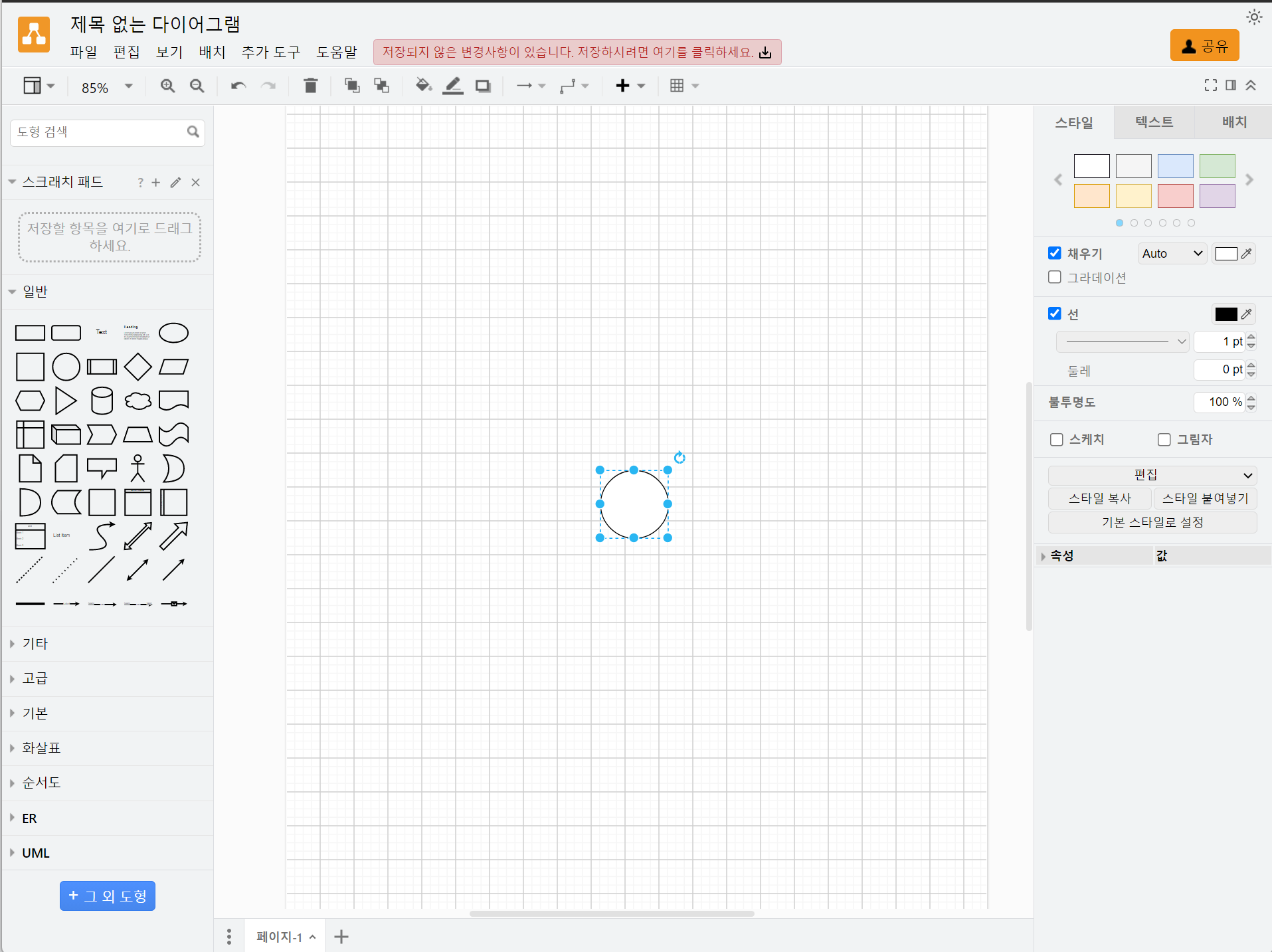 오른쪽은 다양한 도구가 있고, 왼쪽은 그려진 항목의 상세 설정이 가능합니다.