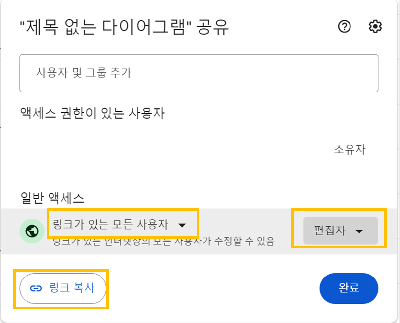 액세스 권한에 따라 링크 복사를 하여 공유하면 팀원 또는 조원들과 동시에 편집이 가능해집니다.