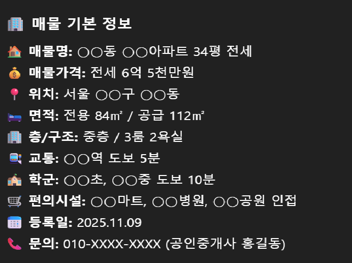 🏠 공인중개사 블로그, 이렇게 운영하세요!— 반복되는 매물 포스팅을 효율적으로 관리하는 방법부동산 중개업을 하다 보면 하루에도 여러 번 매물을 등록해야 합니다.그런데 매번 처음부터 글을 새로 작성하다 보면 시간이 너무 오래 걸리죠.그래서 ‘포스팅 형식(템플릿)’을 정해두고 반복 사용하는 방식을 추천드립니다.이건 단순히 시간을 아끼는 문제를 넘어, 브랜드 신뢰도와 검색 노출에도 큰 도움이 됩니다.📌 왜 형식이 중요할까?검색 노출에 유리함네이버 블로그는 ‘구조화된 정보’를 선호합니다.비슷한 포맷으로 꾸준히 글을 올리면, 매물 정보가 체계적으로 쌓이면서 검색 상위 노출 확률이 높아집니다.브랜드 일관성 유지고객 입장에서는 글의 디자인과 구성만 봐도 “이 중개사 글이구나” 하는 인식을 갖게 됩니다.신뢰감은 작..