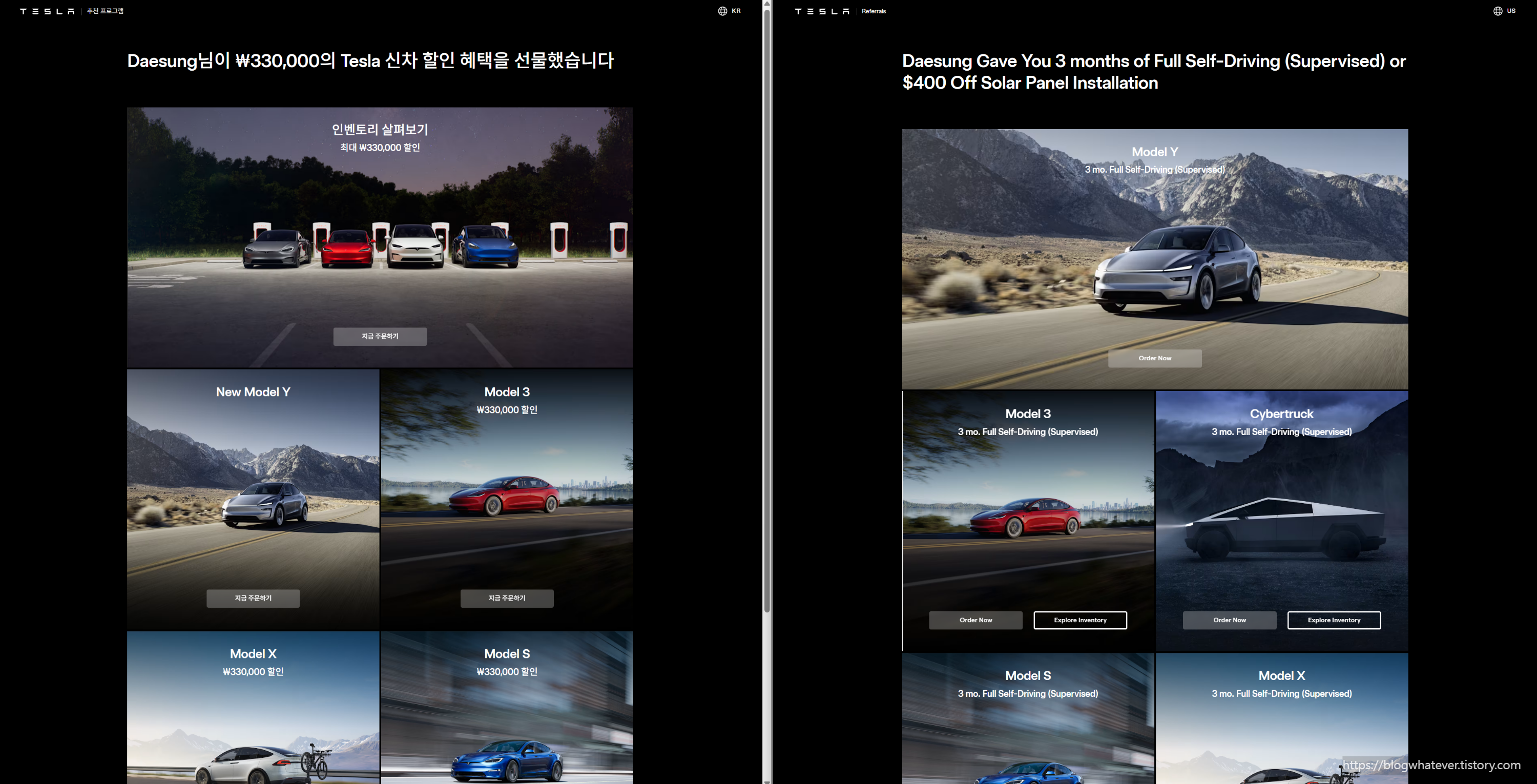 🚗 2025 테슬라 신차 할인 혜택 안내 (Model Y 포함) – 레퍼럴 코드로 절약하세요!2025년부터 테슬라의 레퍼럴 프로그램이 새롭게 리뉴얼되며, 신차 구매 시 할인 혜택이 제공되고 있습니다.특히 올해는 Model Y 주니퍼(신형) 모델이 출시되어 많은 분들이 관심을 가지고 계시죠!이 글에서는 테슬라 할인 혜택과 레퍼럴 코드 이용 방법,그리고 제 링크를 통해 차량을 구매해주신 분들께 선물을 준비하고 있음을 말씀드립니다.✅ 테슬라 레퍼럴 프로그램이란?기존 오너의 추천 링크를 통해 테슬라 차량을 구매하면,신규 구매자와 추천인 모두에게 할인 또는 크레딧 혜택이 제공되는 제도입니다. 아래 링크를 통해 인벤토리를 들어가셔서 테슬라 차량 구매를 진행하시면, 자동으로 33만원 할인 혜택이 적용됩니다. 🔗..